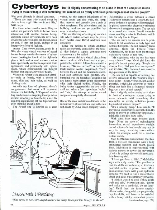The Virtual Sex Machine is protected by Law, and is patent pending. The Phrase "Virtual Sex Machine™," "enhanced with Teledildonics," and the graphic representation of these words, are  trademarks of Virtual Reality Innovations. Copyright © 1997-2010 Virtual Reality Innovations . All rights are reserved. No portion of this website may be used for any purpose without express written permission. Members of the media can contact us for approved use which will be provided immediately at no charge upon confirmation. We welcome media attention. 2257 Information can be found here: 2257